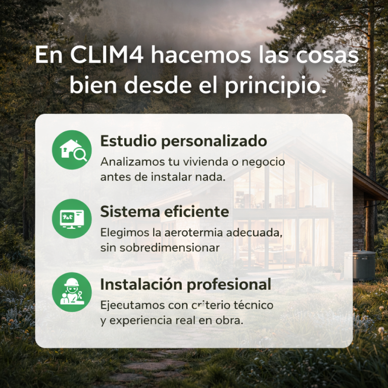 CLIM4 es una empresa especializada en aerotermia y soluciones de eficiencia energética para viviendas. Diseñamos e instalamos sistemas de climatización eficientes, bien dimensionados y pensados para ofrecer confort real, ahorro energético y fiabilidad a largo plazo, siempre a partir de un estudio técnico previo y una ejecución profesional.